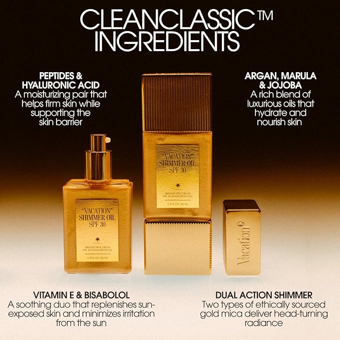 - TOP SHELF SPF 30 PROTECTION: Vacation's shimmer body oil features a broad spectrum SPF 30 formula that is water resistant (80 minutes) and protects against the sun’s harmful UVA and UVB rays.