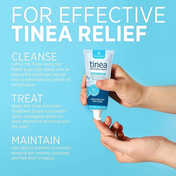 - Product Benefits : Roycederm’s tinea kit cleanses, soothes, and hydrates skin affected by fungal conditions, reducing redness, itching, and irritation while supporting natural recovery for long-lasting comfort. Roycederm’s tinea kit cleanses, soothes, and hydrates skin affected by fungal conditions, reducing redness, itching, and irritation while supporting natural recovery for long-lasting comfort.